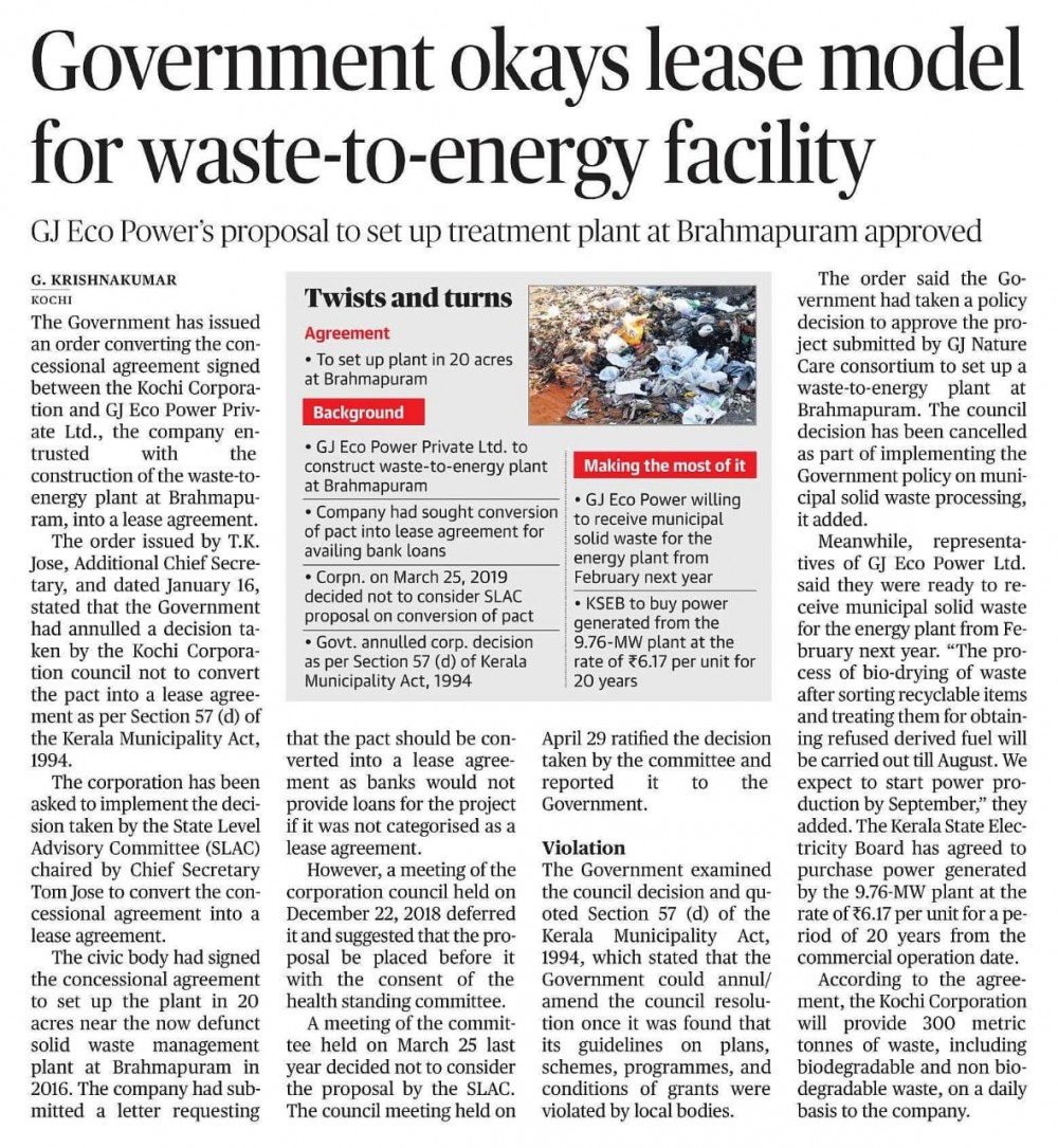 Govt. okays lease agreement for Brahmapuram WtE plant
