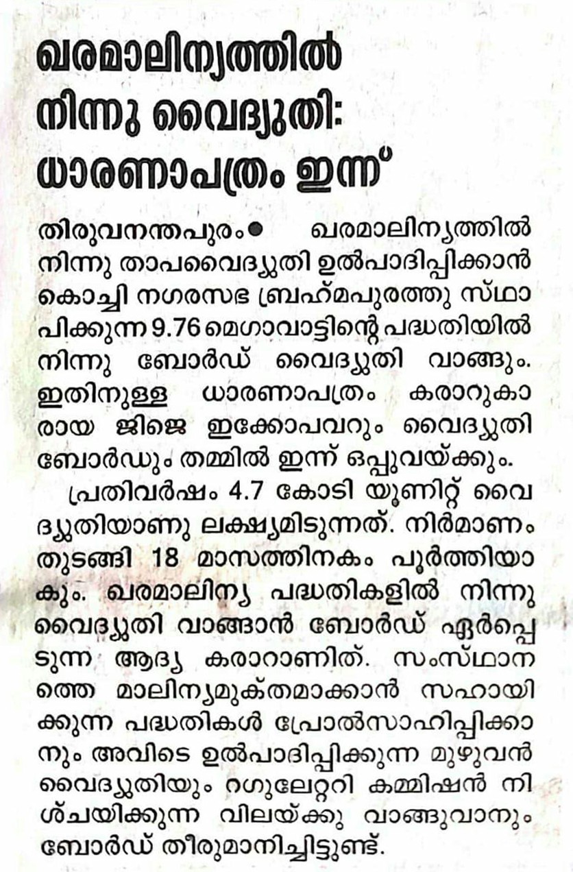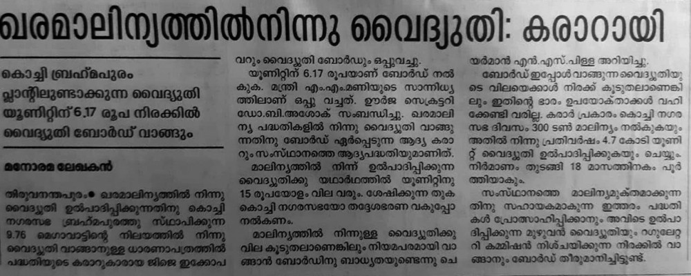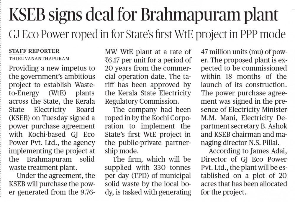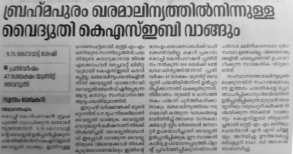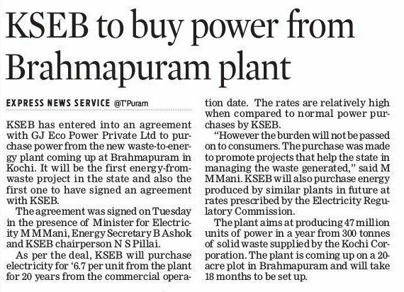 07 Mar, 2018 - KSEB to buy power at 6.17 per unit from Brahmapuram Waste to Energy plant